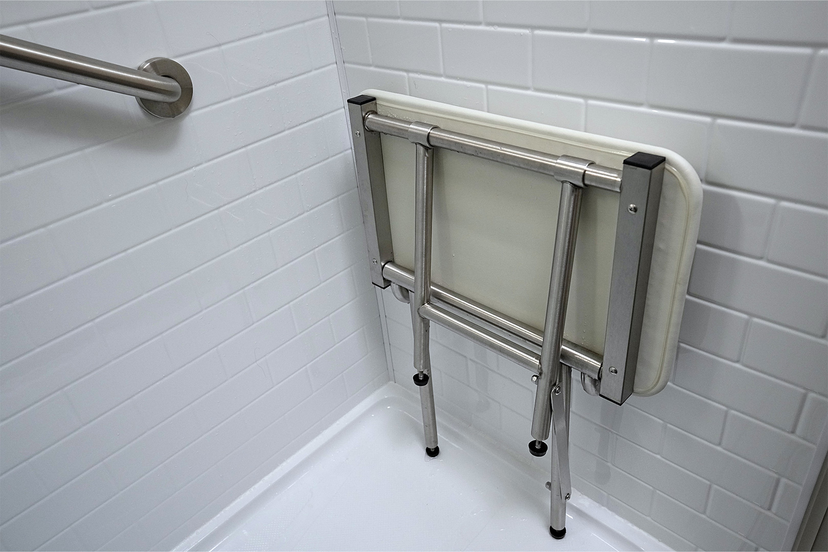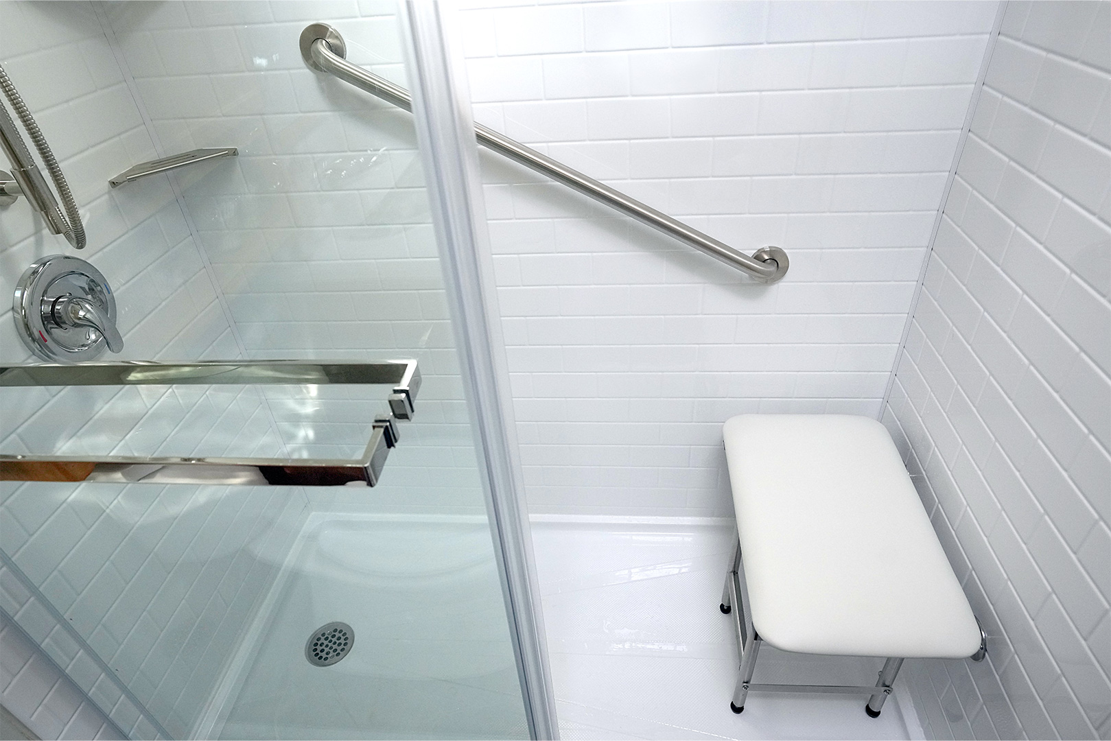Three (3) stainless steel safety grab bars positioned for optimal support